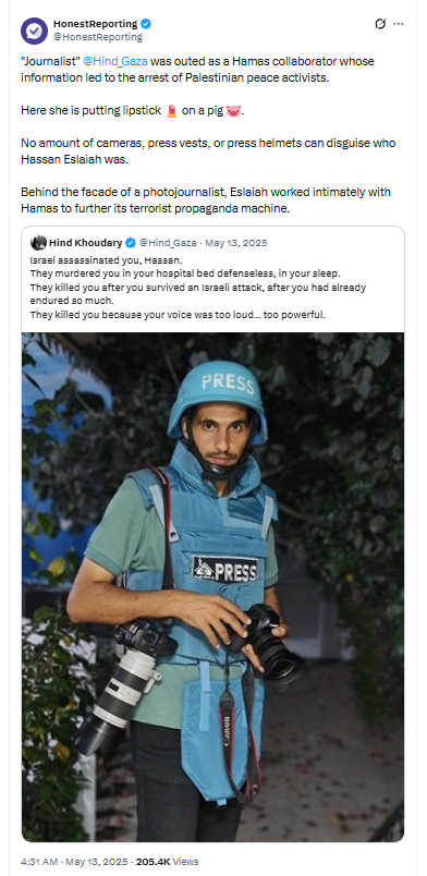 Incitement #10"Journalist" @Hind_Gaza was outed as a Hamas collaborator whose information led to the arrest of Palestinian peace activists. Here she is putting lipstick š on a pig š·. No amount of cameras, press vests, or press helmets can disguise who Hassan Eslaiah was. Behind the facade of a photojournalist, Eslaiah worked intimately with Hamas to further its terrorist propaganda machine.