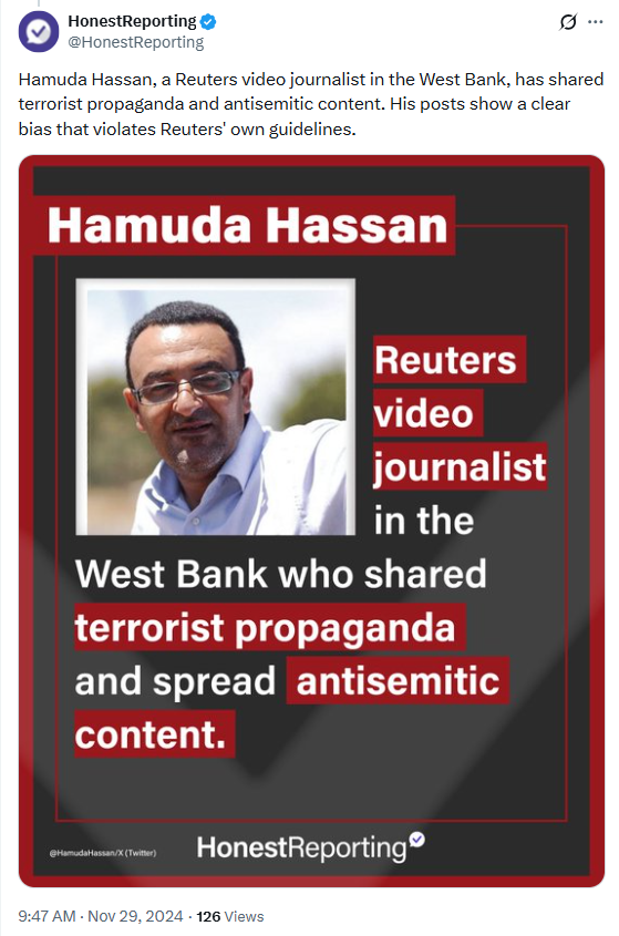 Incitement #29Hamuda Hassan, a Reuters video journalist in the West Bank, has shared terrorist propaganda and antisemitic content. His posts show a clear bias that violates Reuters' own guidelines.