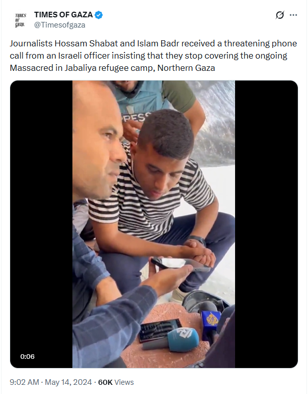 Incitement #104Journalists Hossam Shabat and Islam Badr received a threatening phone call from an Israeli officer insisting that they stop covering the ongoing Massacred in Jabaliya refugee camp, Northern Gaza