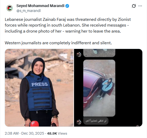 Incitement #91Lebanese journalist Zainab Faraj was threatened directly by Zionist forces while reporting in south Lebanon. She received messages - including a drone photo of her - warning her to leave the area. Western journalists are completely indifferent and silent.
