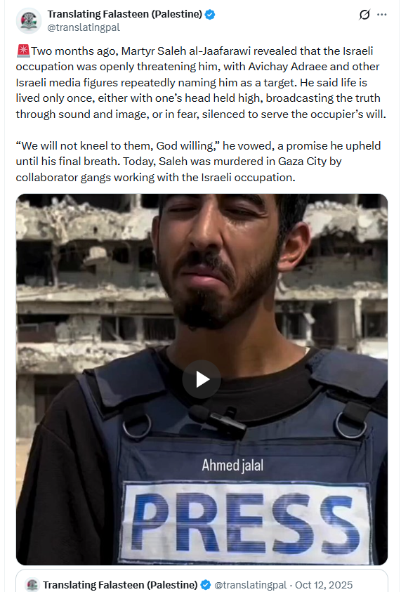 Incitement #79đ¨Two months ago, Martyr Saleh al-Jaafarawi revealed that the Israeli occupation was openly threatening him, with Avichay Adraee and other Israeli media figures repeatedly naming him as a target. He said life is lived only once, either with oneâs head held high, broadcasting the truth through sound and image, or in fear, silenced to serve the occupierâs will. âWe will not kneel to them, God willing,â he vowed, a promise he upheld until his final breath. Today, Saleh was murdered in Gaza City by collaborator gangs working with the Israeli occupation.