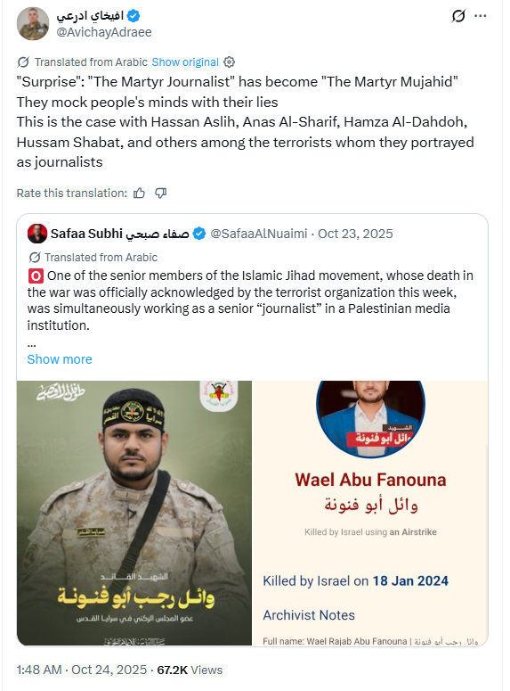 Incitement #83"Surprise": "The Martyr Journalist" has become "The Martyr Mujahid" They mock people's minds with their lies This is the case with Hassan Aslih, Anas Al-Sharif, Hamza Al-Dahdoh, Hussam Shabat, and others among the terrorists whom they portrayed as journalists