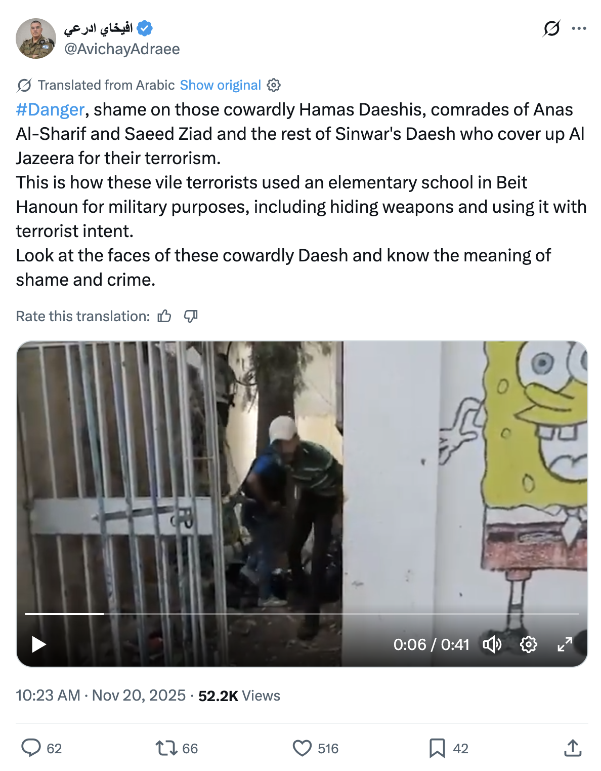 Incitement #2#Danger, shame on those cowardly Hamas Daeshis, comrades of Anas Al-Sharif and Saeed Ziad and the rest of Sinwar's Daesh who cover up Al Jazeera for their terrorism. This is how these vile terrorists used an elementary school in Beit Hanoun for military purposes, including hiding weapons and using it with terrorist intent. Look at the faces of these cowardly Daesh and know the meaning of shame and crime.