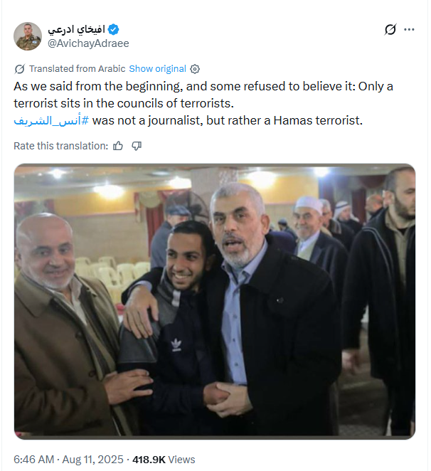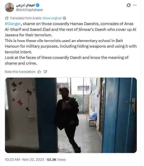 Incitement #4The sound and image of lying. It's clear that being proud of them is evident. He covers up the crimes of Hamas and Islamic Jihad in taking shelter inside schools... I'm convinced that Anas al-Sharif knows a large number of those killed inside the Al-Tabi'een school by Hamas's saboteurs by their names, but he moves in a false media theater with motives that have no relation to the residents of Gaza.