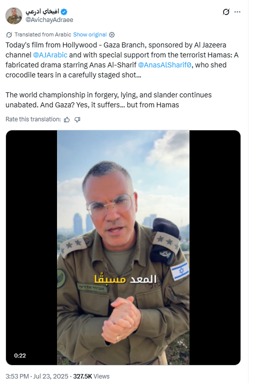 Incitement #47Today's film from Hollywood - Gaza Branch, sponsored by Al Jazeera channel @AJArabic and with special support from the terrorist Hamas: A fabricated drama starring Anas Al-Sharif @AnasAlSharif0, who shed crocodile tears in a carefully staged shot... The world championship in forgery, lying, and slander continues unabated. And Gaza? Yes, it suffers... but from Hamas