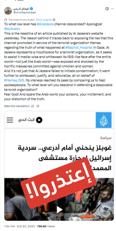 Incitement #9To what low level has #AlJazeera channel descended? Apologize! @AJArabic This is the headline of an article published by Al Jazeera's website yesterday. The reason behind it traces back to exposing the lies that this channel promoted in service of the terrorist organization Hamas regarding the truth of what happened at #Baptist_Hospital in Gaza. Al Jazeera represents a mouthpiece for a terrorist organization, as it seeks to assist it media-wise and whitewash its ISIS-like face after the entire world—not just the Arab world—was exposed and shocked by the horrific massacres committed against children and women. And it's not just that Al Jazeera failed to initiate condemnation; it went further to whitewash, justify, and rationalize, all on behalf of #Hamas_ISIS. Its vileness reached its peak by comparing us to Nazi spokespeople. To what level will you descend in defending a despicable terrorist organization? Fear God! And spare the Arab world your poisons, your incitement, and your distortion of the truth.