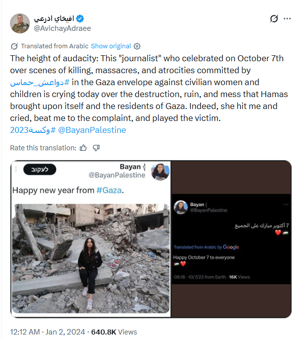 Incitement #5The height of audacity: This "journalist" who celebrated on October 7th over scenes of killing, massacres, and atrocities committed by #دواعش_حماس in the Gaza envelope against civilian women and children is crying today over the destruction, ruin, and mess that Hamas brought upon itself and the residents of Gaza. Indeed, she hit me and cried, beat me to the complaint, and played the victim. #وكسة2023 @BayanPalestine