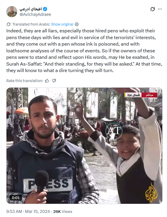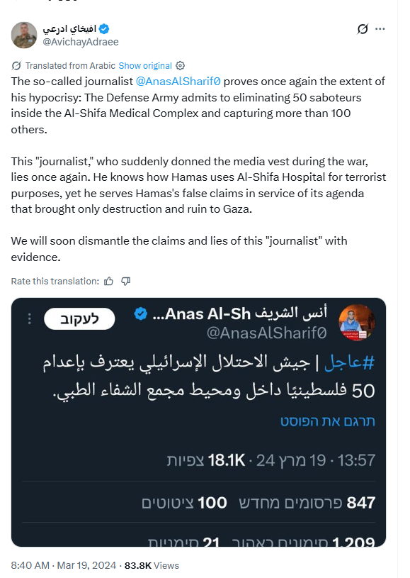 Incitement #44The so-called journalist @AnasAlSharif0 proves once again the extent of his hypocrisy: The Defense Army admits to eliminating 50 saboteurs inside the Al-Shifa Medical Complex and capturing more than 100 others. This "journalist," who suddenly donned the media vest during the war, lies once again. He knows how Hamas uses Al-Shifa Hospital for terrorist purposes, yet he serves Hamas's false claims in service of its agenda that brought only destruction and ruin to Gaza. We will soon dismantle the claims and lies of this "journalist" with evidence.