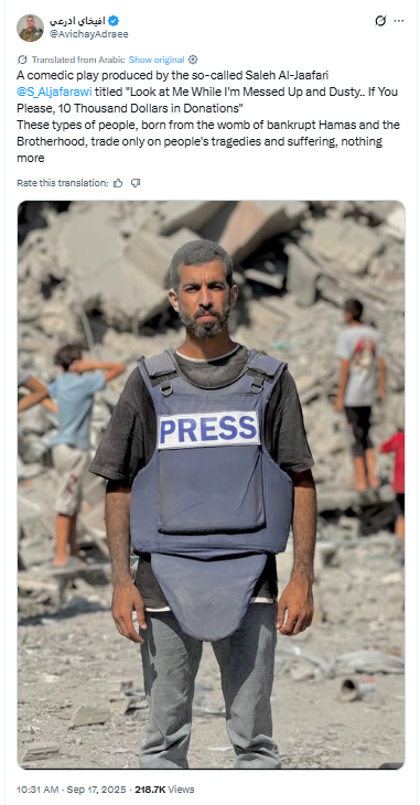 Incitement #76A comedic play produced by the so-called Saleh Al-Jaafari @S_Aljafarawi titled "Look at Me While I'm Messed Up and Dusty.. If You Please, 10 Thousand Dollars in Donations" These types of people, born from the womb of bankrupt Hamas and the Brotherhood, trade only on people's tragedies and suffering, nothing more