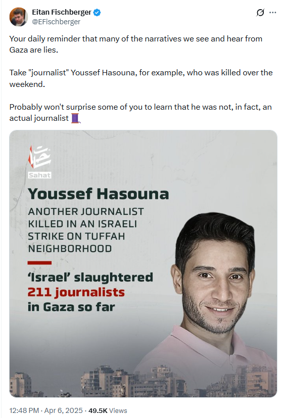 Incitement #31Your daily reminder that many of the narratives we see and hear from Gaza are lies. Take "journalist" Youssef Hasouna, for example, who was killed over the weekend. Probably won't surprise some of you to learn that he was not, in fact, an actual journalist 🧵
