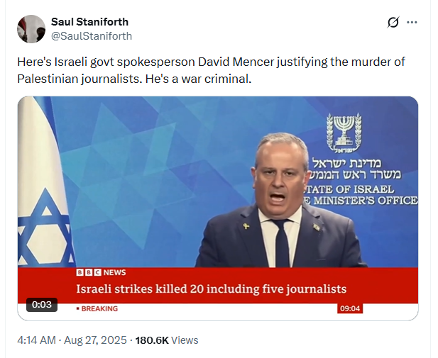 Incitement #64Here's Israeli govt spokesperson David Mencer justifying the murder of Palestinian journalists. He's a war criminal.