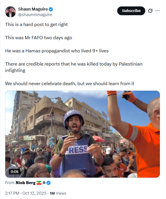 Incitement #77This is a hard post to get right This was Mr FAFO two days ago He was a Hamas propagandist who lived 9+ lives There are credible reports that he was killed today by Palestinian infighting We should never celebrate death, but we should learn from it