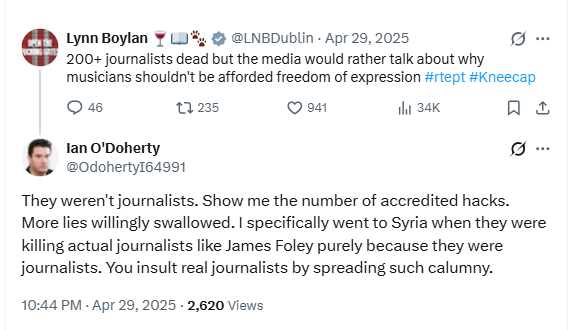 Incitement #101They weren't journalists. Show me the number of accredited hacks. More lies willingly swallowed. I specifically went to Syria when they were killing actual journalists like James Foley purely because they were journalists. You insult real journalists by spreading such calumny.