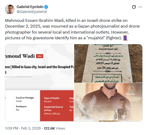 Incitement #102Mahmoud Essam Ibrahim Wadi, killed in an Israeli drone strike on December 2, 2025, was mourned as a Gazan photojournalist and drone photographer for several local and international outlets. However, pictures of his gravestone identify him as a "mujahid" (fighter). 🧵