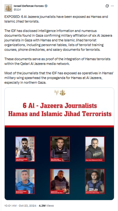 Incitement #14EXPOSED: 6 Al Jazeera journalists have been exposed as Hamas and Islamic Jihad terrorists. The IDF has disclosed intelligence information and numerous documents found in Gaza confirming military affiliation of six Al Jazeera journalists in Gaza with Hamas and the Islamic Jihad terrorist organizations, including personnel tables, lists of terrorist training courses, phone directories, and salary documents for terrorists. These documents serve as proof of the integration of Hamas terrorists within the Qatari Al Jazeera media network. Most of the journalists that the IDF has exposed as operatives in Hamas' military wing spearhead the propaganda for Hamas at Al Jazeera, especially in northern Gaza.