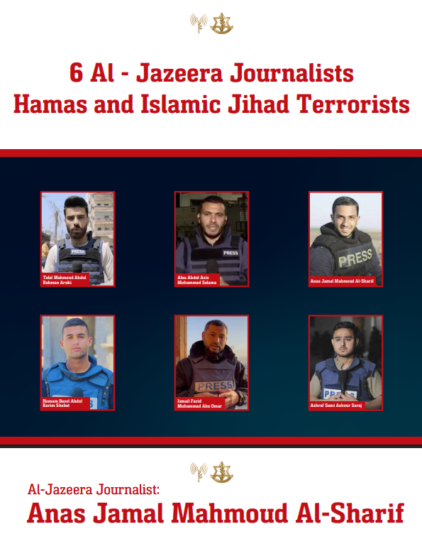 Incitement #51The IDF says it has uncovered documents in the Gaza Strip that it claims reveal that six Al Jazeera journalists are operatives in the Hamas and Palestinian Islamic Jihad terror groups. The journalists are named by the IDF as Anas al-Sharif, Alaa Salameh, Hossam Shabat, Ashraf al-Sarraj, Ismail Abu Omar, and Talal al-Arrouqi. According to the IDF, al-Sharif was the head of a rocket launching squad and a member of a Nukhba Force company in Hamas's Nuseirat Battalion; Salameh was the deputy head of the Shaboura Battalion's propaganda unit, in Islamic Jihad; Shabat was a sniper in Hamas's Beit Hanoun Battalion; al-Sarraj was a member of Islamic Jihad's Bureij Battalion; Abu Omar served as a training company commander in the East Khan Younis Battalion, and he had been wounded in an Israeli airstrike several months ago; and al-Arrouqi was a team commander in Hamas's Hamas's Nuseirat Battalion. The military releases the documents, which it says show personnel spreadsheets, lists of training courses, telephone books, and salary documents. It says the documents "unequivocally prove" that the journalists functioned as members of Hamas and Islamic Jihad's respective military wings. "These documents are proof of the involvement of Hamas terrorists in the Qatari media network, Al-Jazeera," the IDF says in a statement. The IDF says that the named journalists are "spearheading" the spread of Hamas propaganda on Al Jazeera, especially in the northern Gaza Strip. In January, Israel said an Al Jazeera staff journalist and a freelancer killed in an airstrike in Gaza were terror operatives. The following month, it accused another journalist with the channel, who was wounded in a separate strike, of being a deputy company commander with Hamas. Al Jazeera has fiercely denied Israel's allegations and accused it of systematically targeting Al Jazeera employees in the Gaza Strip.