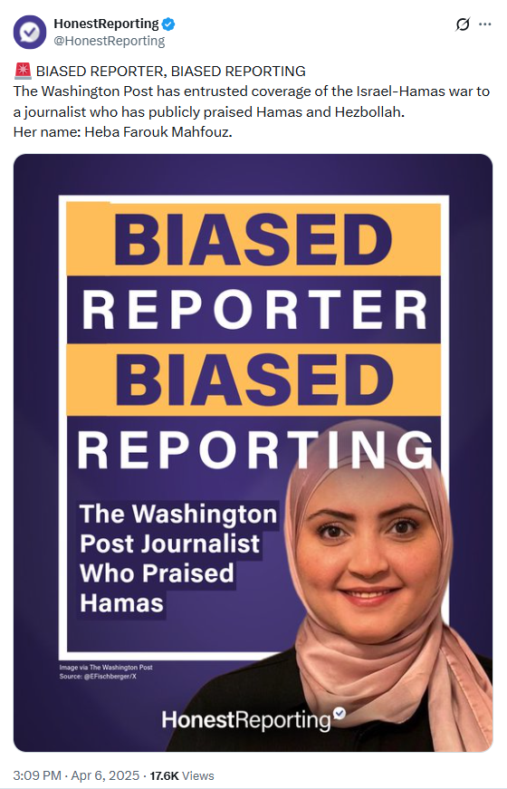 Incitement #20🚨 BIASED REPORTER, BIASED REPORTING The Washington Post has entrusted coverage of the Israel-Hamas war to a journalist who has publicly praised Hamas and Hezbollah. Her name: Heba Farouk Mahfouz.
