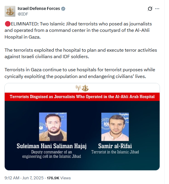 Incitement #40🔴ELIMINATED: Two Islamic Jihad terrorists who posed as journalists and operated from a command center in the courtyard of the Al-Ahli Hospital in Gaza. The terrorists exploited the hospital to plan and execute terror activities against Israeli civilians and IDF soldiers. Terrorists in Gaza continue to use hospitals for terrorist purposes while cynically exploiting the population and endangering civilians’ lives.