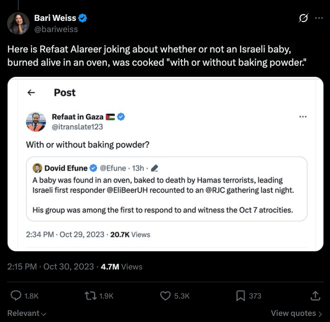 Incitement #105Here is Refaat Alareer joking about whether or not an Israeli baby, burned alive in an oven, was cooked "with or without baking powder."